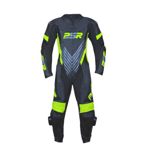 Maximize your visibility and performance on the track with the PSR Sports Racing Suit 1006. This professional one-piece suit is crafted from premium, high-abrasion-resistant cowhide leather, featuring a dominant black chassis that contrasts sharply with aggressive neon yellow accents for an unmistakable presence. The chest is highlighted by a central, vibrant neon yellow "PSR" logo sitting atop a modern, grey geometric fade pattern that adds a layer of technical sophistication to the design. Engineered for speed, the suit incorporates neon yellow accordion stretch panels above the knees and on the lower back, ensuring a seamless, aerodynamic fit that adapts to the rider's movements in the tuck position. Protection is paramount, utilizing external shoulder armor caps and replaceable knee sliders designed to withstand the rigors of high-speed cornering. For optimal comfort, the 1006 features perforated leather zones on the thighs for ventilation and breathable stretch fabric inserts on the inner arms to reduce fatigue and enhance flexibility.