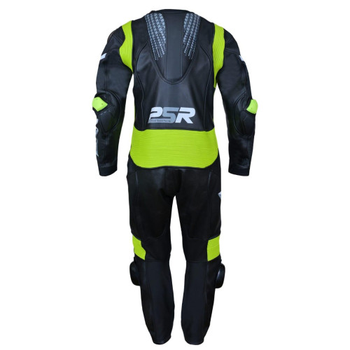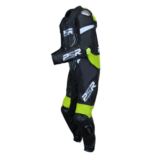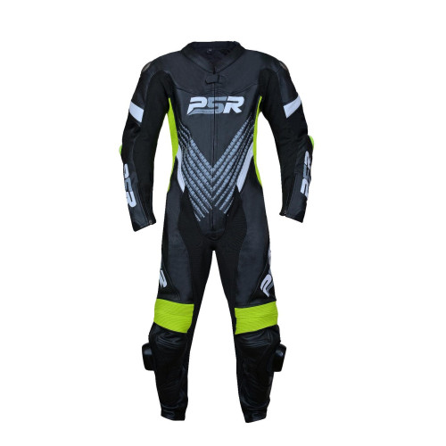 Dominate the grid with the PSR Sports Racing Suit 1001, a professional-grade one-piece suit designed for maximum aerodynamic efficiency and protection. Constructed from premium cowhide leather, this suit features a striking visual design with a dominant black base contrasted by vibrant neon yellow panels on the sides, inner arms, and knees for high visibility. The chest area is highlighted by a unique, modern grey geometric fade pattern that sits behind the central "PSR" logo, giving the suit a distinct, aggressive look. Engineered for the track, it includes accordion stretch panels in neon yellow above the knees to ensure unrestricted movement when tucked in. Safety is prioritized with external shoulder armor caps and integrated knee sliders (pucks) designed for extreme lean angles. The suit also features stretch fabric inserts on the inner arms to reduce fatigue and improve fit, while the perforated leather sections on the thighs provide essential ventilation during heated rides.